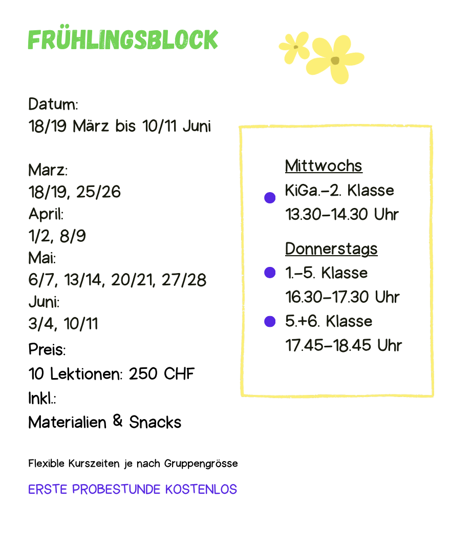 Die Kurse sind alle auf Englisch. Die Kinder erleben viele praktische und lustige themenbezogene Aktivitäten. Geschichten, Spiele, Basteln, Kochen, Experimente, Lieder und Tänze, Abenteuer, kurze Theaterstücke und vieles mehr erwartet die Kinder in meinem Unterricht. Und natürlich lernen sie gleichzeitig Englisch dazu.